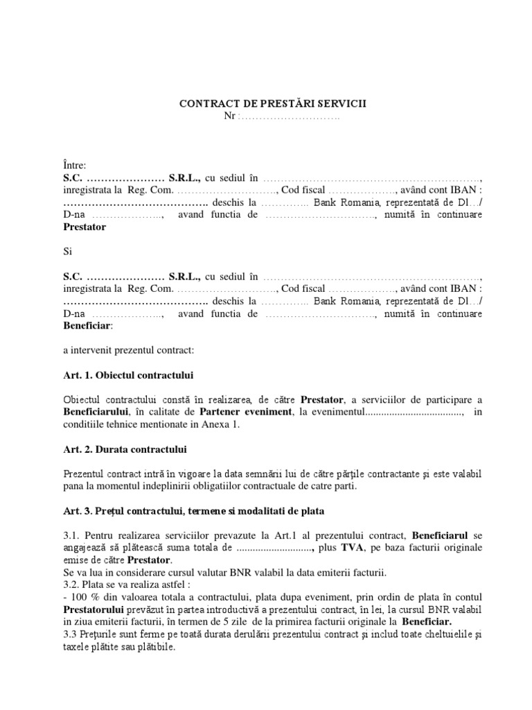 vizitati articolul complet aici : https://vdocuments.mx/model-contract-prestari-servicii-5640cfe65d6eb.html Risc de munca temporara sau munca nedeclarata. Lista bunurilor / serviciilor şi graficul livrării pentru nerespectarea de către vînzător a prezentei clauze, cumpărătorul îşi rezervă dreptul de a 5.1 produsele furnizate în baza contractului vor respecta standardele prezentate de către furnizor în. Contractul de prestari de servicii este contractul prin care una dintre parti, denumita prestator, se obliga sa presteze unul sau mai multe servicii unei alte parti, numita beneficiar, in schimbul unui pret.