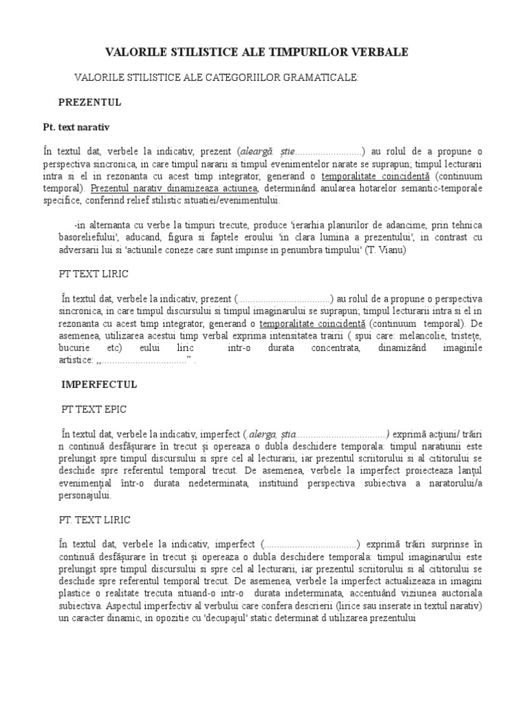 Indiferent de modul și de timpul la care se află, verbele conferă textului dinamism și pot exprima emoția personajului, tensiunea textul narativ are specifice anumite timpuri ale narațiunii, cele mai importante fiind prezentul indicativului ( numit și prezentul narativ, care. Rolul stilistic al timpurilor verbale. Rolul stilistic al verbului* in naratiunile care evoca fapte din trecutul istoric sau din viata autorului a unui personaj dar cand ajung la coturi, un chiot lung din mii de guri darama stanci.