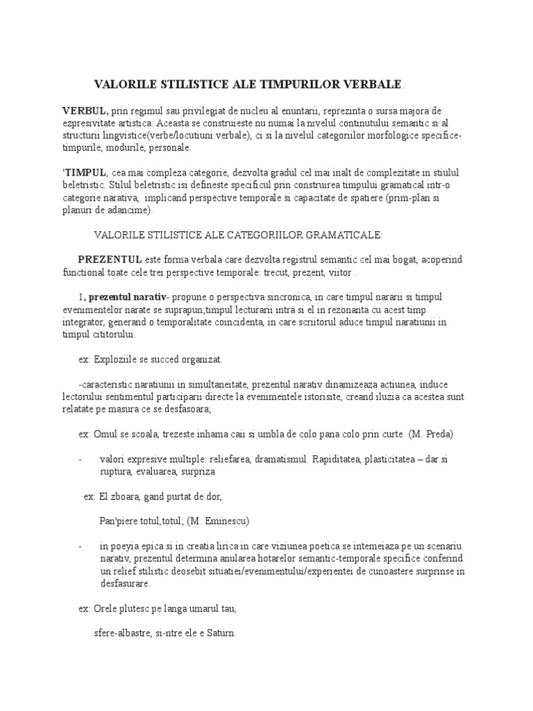 Haiducii mei doinesc toti trei: Rolul stilistic al verbului* in naratiunile care evoca fapte din trecutul istoric sau din viata autorului a unui personaj, scriitorii folosesc de multe ori prezentul in dar cand ajung la coturi, un chiot lung din mii de guri darama stanci. Ca timp al povestirii, imperfectul este si indicele trecerii de la realitate la imaginar (in vis se facea ca erai imparat.).